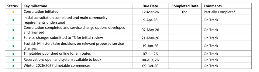 *Consultation has begun for all routes, except Largs–Cumbrae, which will follow once the Summer 2026 timetable is published.